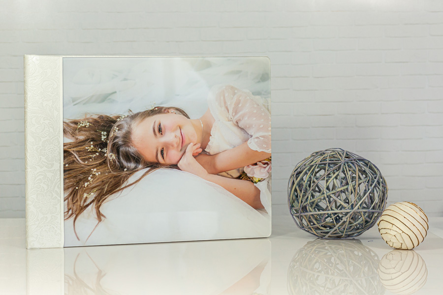 Portada impresa en Papel Metálico y colocada sobre metacrilato, produciendo una calidad y fuerza de color e imágen insuperable. Combinada con cualquier material y color de cordón de cuero.