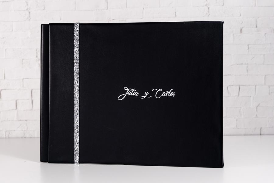 Álbum fabricado en 2 o 3 piezas, con pasameneria de pedrería en vertical y personalizado.