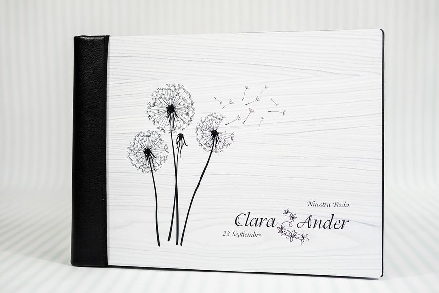 Álbum fabricado en 1 pieza combinando material y tapa en madera de Haya natural tintada en blanco y personalizado con grabado láser o impresión UVI.