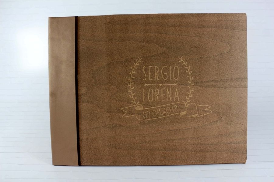 Álbum realizado montando el lomo sobre la tapa de madera. Se puede personalizar con cualquiera de los diseño fotográficos disponibles o uno diseñado por el cliente.