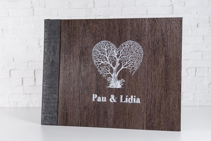 La tapa del álbum esta realizada con doble tapa con material más madera en color haya natural, blanco o antiguo. Puedes añadir un grabado láser.