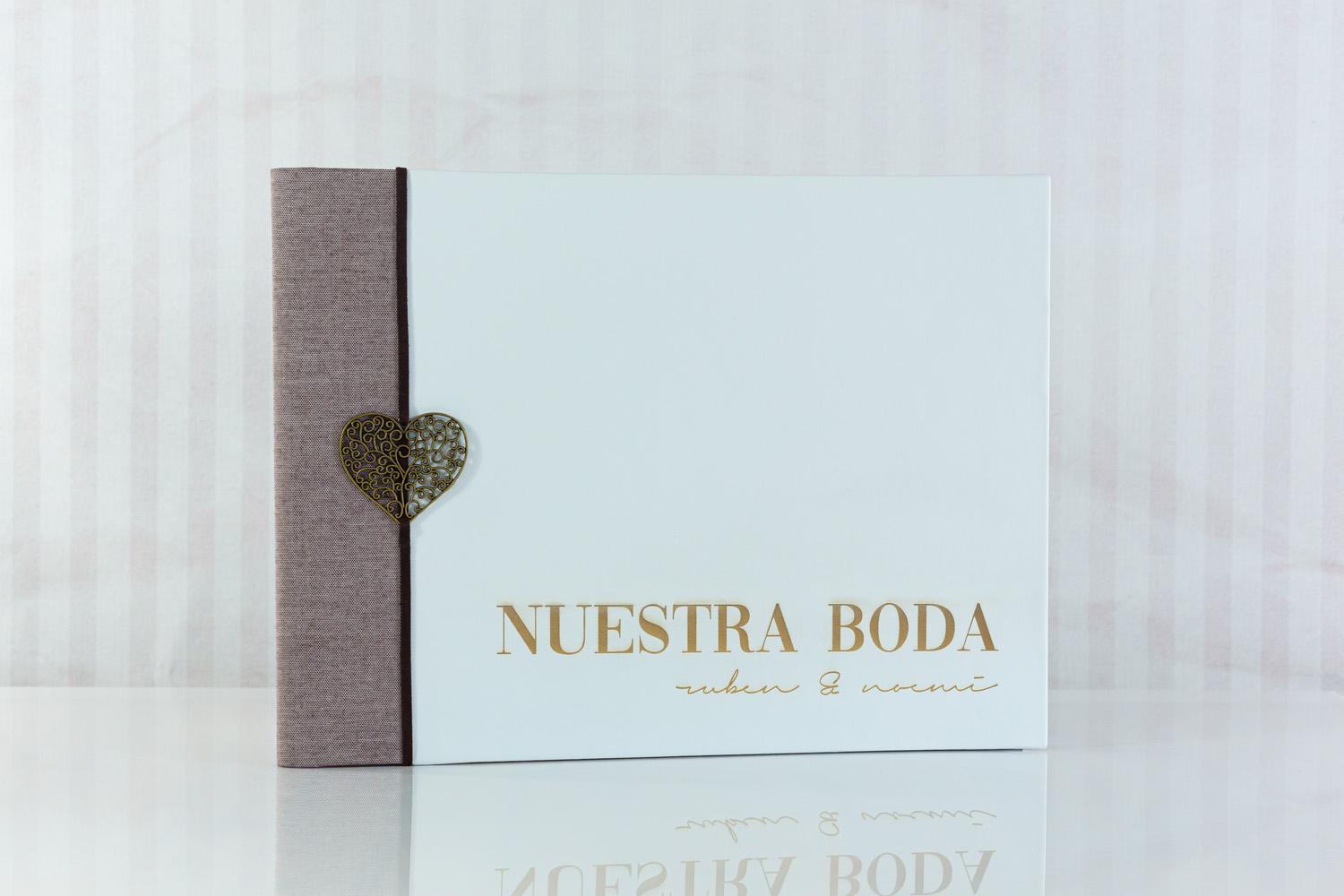 Álbum realizado montando el lomo sobre la tapa generando 1 sola pieza. Puedes elegir un material distinto para la portada y otro para el lomo/trasera. Se puede personalizar con un grabado láser en la portada.