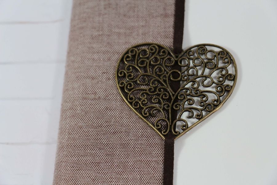 El álbum se puede realizar con un cordón de cuero y un aplique en forma de corazón en la unión de los dos materiales.